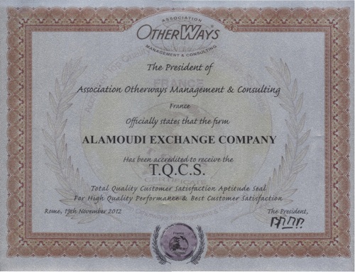 Association OTHERWAYS MANAGEMENT AND CONSULTING awarded ALAMOUDI EXCHANGE COMPANY with the Global Award For Perfection Quality And Performance, for the year 2012.